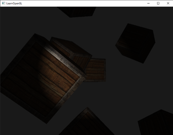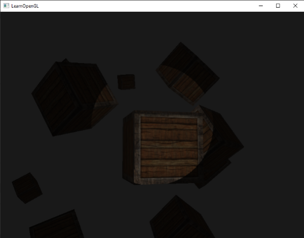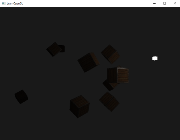 如果你将10个箱子加入到上一节光照场景中,你会注意到在最后面的箱子和在灯面前的箱子都以相同的强度被照亮,并没有定义一个公式来将光随距离衰减。我们希望在后排的箱子与前排的箱子相比仅仅是被轻微地照亮。