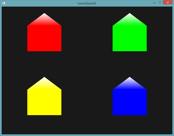 所有发射出的顶点都将嵌有最后储存在fColor中的值,即顶点的颜色属性值。所有的房子都会有它们自己的颜色了: