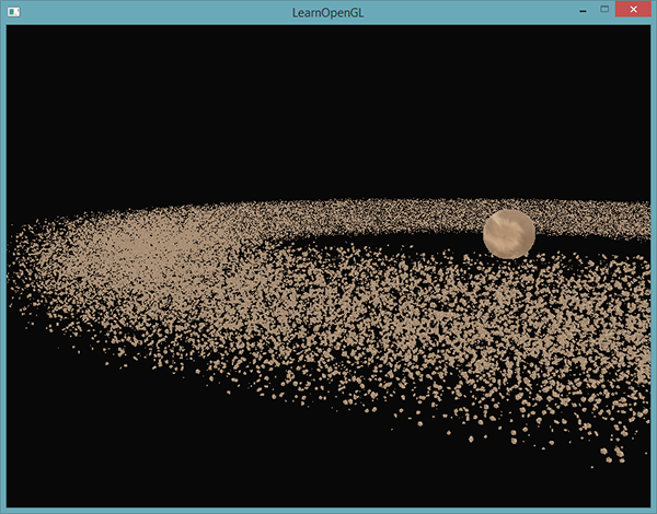 这个场景每帧包含1001次渲染调用,其中1000个是岩石模型。你可以在[这里](https://learnopengl.com/code_viewer_gh.php?code=src/4.advanced_opengl/10.2.asteroids/asteroids.cpp)找到源代码。