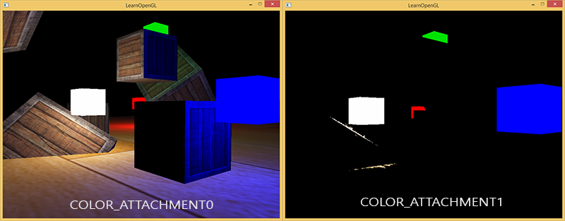 有了两个颜色缓冲,我们就有了一个正常场景的图像和一个提取出的亮区的图像。这些都在一个渲染步骤中完成。