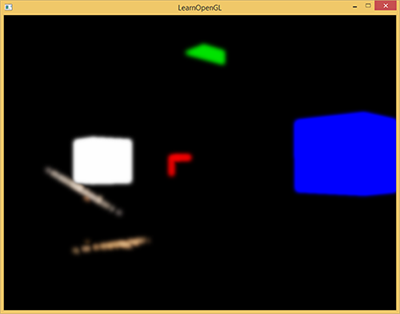 我们来一步一步解释这个处理过程。我们在场景中渲染一个带有4个立方体形式不同颜色的明亮的光源。带有颜色的发光立方体的亮度在1.5到15.0之间。如果我们将其渲染至HDR颜色缓冲,场景看起来会是这样的: