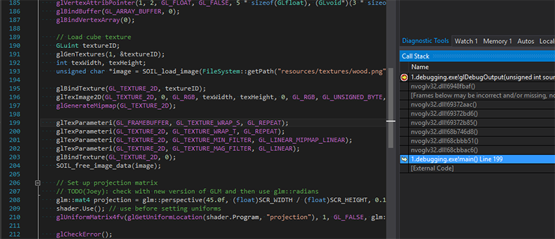 虽然没有glGetError普遍,但一个叫做调试输出(Debug Output)的OpenGL拓展是一个非常有用的工具,它在4.3版本之后变为了核心OpenGL的一部分。通过使用调试输出拓展,OpenGL自身会直接发送一个比起glGetError更为完善的错误或警告信息给用户。它不仅提供了更多的信息,也能够帮助你使用调试器(Debugger)捕捉错误源头。