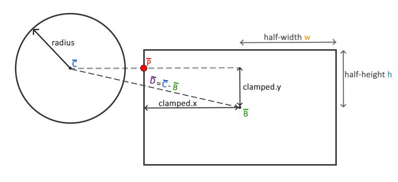 首先我们要获取球心\(\bar{C}\)与AABB中心\(\bar{B}\)的矢量差\(\bar{D}\)。接下来用AABB的半边长(half-extents)\(w\)和\(\bar{h}\)来限制(clamp)矢量\(\bar{D}\)。长方形的半边长是指长方形的中心到它的边的距离;简单的说就是它的尺寸除以2。这一过程返回的是一个总是位于AABB的边上的位置矢量(除非圆心在AABB内部)。