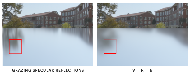 这样,预过滤的环境卷积就不需要关心视角方向了。这意味着当从如下图的角度观察表面的镜面反射时,得到的掠角镜面反射效果不是很好(图片来自文章《Moving Frostbite to PBR》)。然而,通常可以认为这是一个体面的妥协: