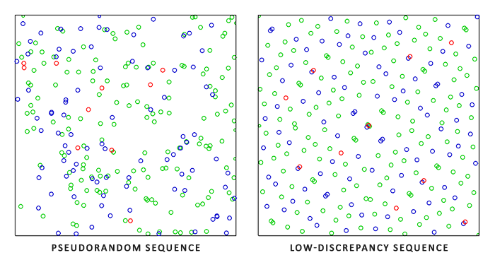 蒙特卡洛积分是一个庞大的数学主题,在此不再赘述,但有一点需要提到:生成随机样本的方法也多种多样。默认情况下,每次采样都是我们熟悉的完全(伪)随机,不过利用半随机序列的某些属性,我们可以生成虽然是随机样本但具有一些有趣性质的样本向量。例如,我们可以对一种名为低差异序列的东西进行蒙特卡洛积分,该序列生成的仍然是随机样本,但样本分布更均匀: