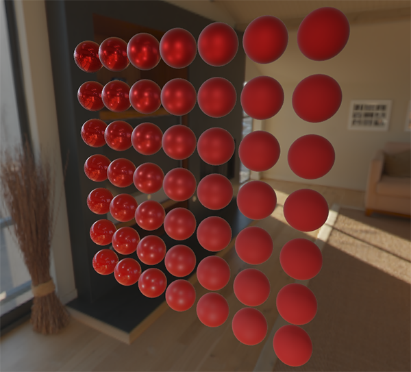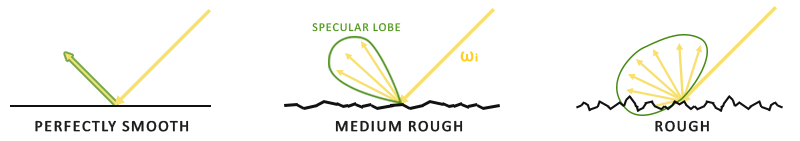 所有可能出射的反射光构成的形状称为镜面波瓣。随着粗糙度的增加,镜面波瓣的大小增加;随着入射光方向不同,形状会发生变化。因此,镜面波瓣的形状高度依赖于材质。