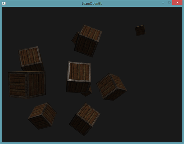 你可以看到,只有前排的箱子被照亮的,距离最近的箱子是最亮的。后排的箱子一点都没有照亮,因为它们离光源实在是太远了。你可以在这里找到程序的代码。