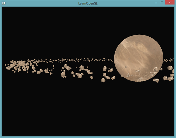 想象这样一个场景,在宇宙中有一个大的行星,它位于小行星带的中央。这样的小行星带可能包含成千上万的岩块,在很不错的显卡上也很难完成这样的渲染。实例化渲染正是适用于这样的场景,因为所有的小行星都可以使用一个模型来表示。每个小行星可以再使用不同的变换矩阵来进行少许的变化。