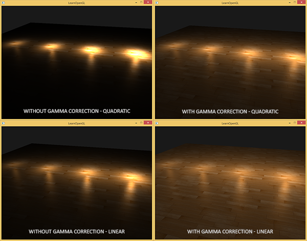 双曲线比使用二次函数变体在不用gamma校正的时候看起来更真实,不过但我们开启gamma校正以后线性衰减看起来太弱了,符合物理的二次函数突然出现了更好的效果。下图显示了其中的不同: