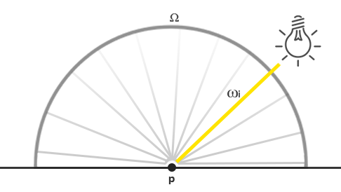 基于以上的知识,我们如何将其转化为之前的教程中所积累的一些光照知识呢? 那么想象一下,我们有一个点光源(一个在所有方向都具有相同亮度的光源),它的辐射通量为用RGB表示为**(23.47, 21.31, 20.79)**。该光源的辐射强度(Radiant Intensity)等于其在所有出射光线的辐射通量。 然而,当我们为一个表面上的特定的点(p)着色时,在其半球领域(\Omega)的所有可能的入射方向上,只有一个入射方向向量(\omega_i)直接来自于该点光源。 假设我们在场景中只有一个光源,位于空间中的某一个点,因而对于(p)点的其他可能的入射光线方向上的辐射率为0:
